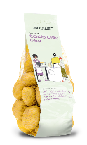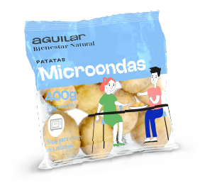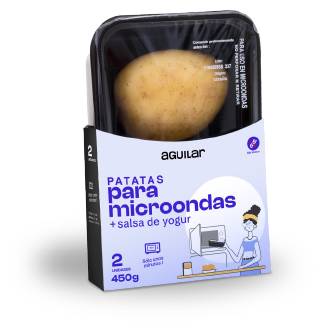 Patatas listas para cocinar al vapor en el microondas, acompañadas de un sobre de salsa yogur para aderezar el producto.